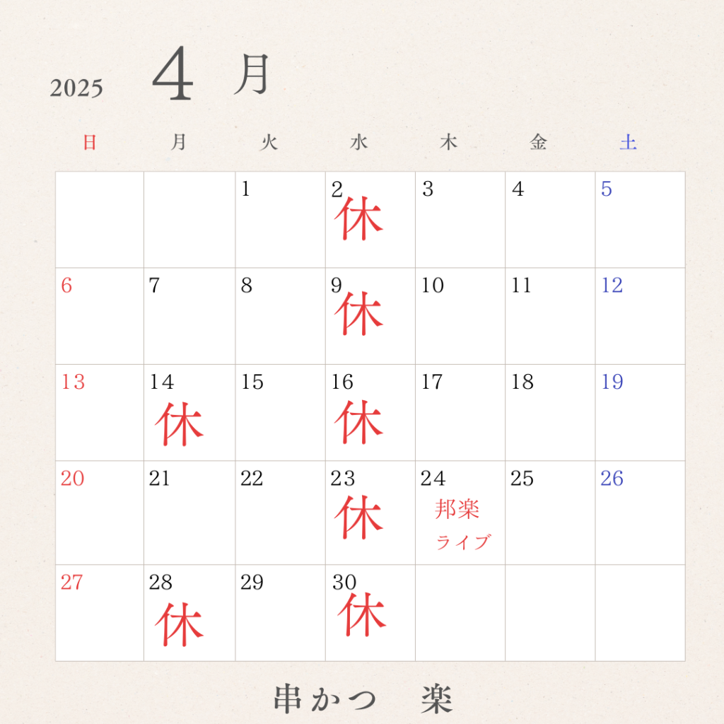 2025年4月1日 / 最終更新日時 : 2025年7月23日 raku 串かつ楽 今月の営業日 4月営業日のお知らせ 串かつ楽です。今月の営業日はこちらです。4月も皆様どうぞよろしくお願いいたします。 ※4月24日は完全予約制の邦楽ライブのため、通常営業は行なっておりません。